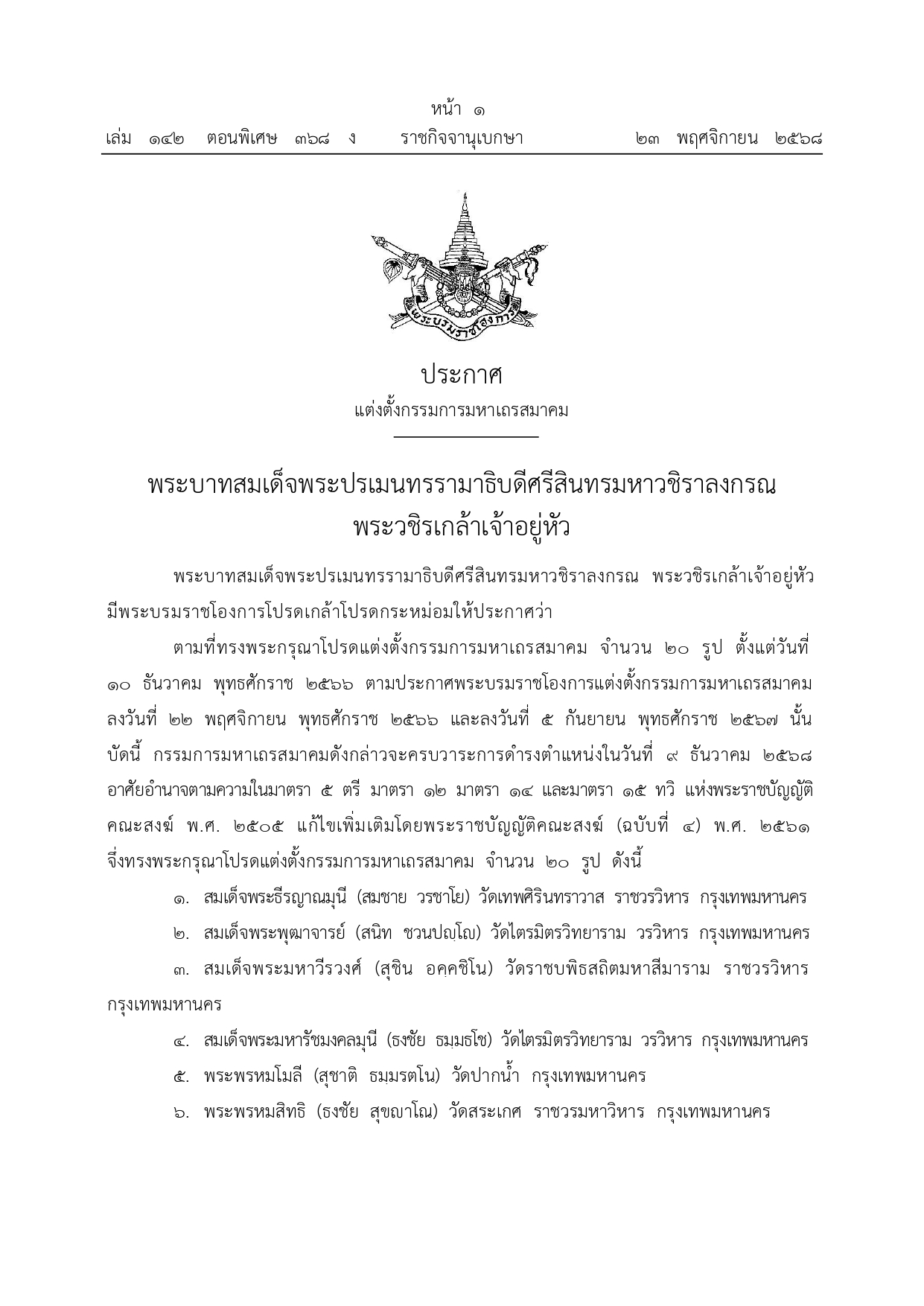 พระบาทสมเด็จพระปรเมนทรรามาธิบดีศรีสินทรมหาวชิราลงกรณ พระวชิรเกล้าเจ้าอยู่หัว มีพระบรมราชโองการโปรดเกล้าโปรดกระหม่อมให้ประกาศว่า ตามที่ทรงพระกรุณาโปรดแต่งตั้งกรรมการมหาเถรสมาคม จำนวน 20 รูป ตั้งแต่วันที่ 10 ธันวาคม 2566 ตามประกาศพระบรมราชโองการแต่งตั้งกรรมการมหาเถรสมาคม ลงวันที่ 22 พฤศจิกายน 2566 และลงวันที่ 5 กันยายน 2567 นั้น