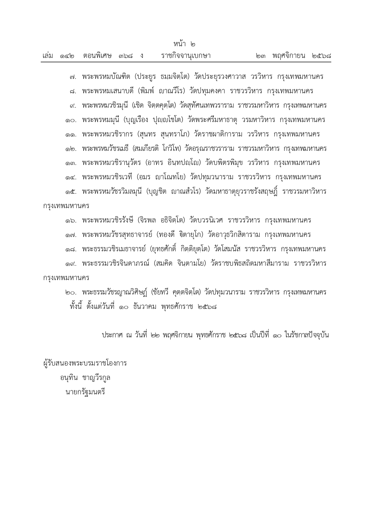 วันที่ 23 พฤศจิกายน 2568 เว็บไซต์ ราชกิจจานุเบกษา ประกาศแต่งตั้งกรรมการมหาเถรสมาคม โดยมี นายอนุทิน ชาญวีรกูล นายกรัฐมนตรี เป็นผู้รับสนองพระบรมราชโองการ โดยระบุว่า