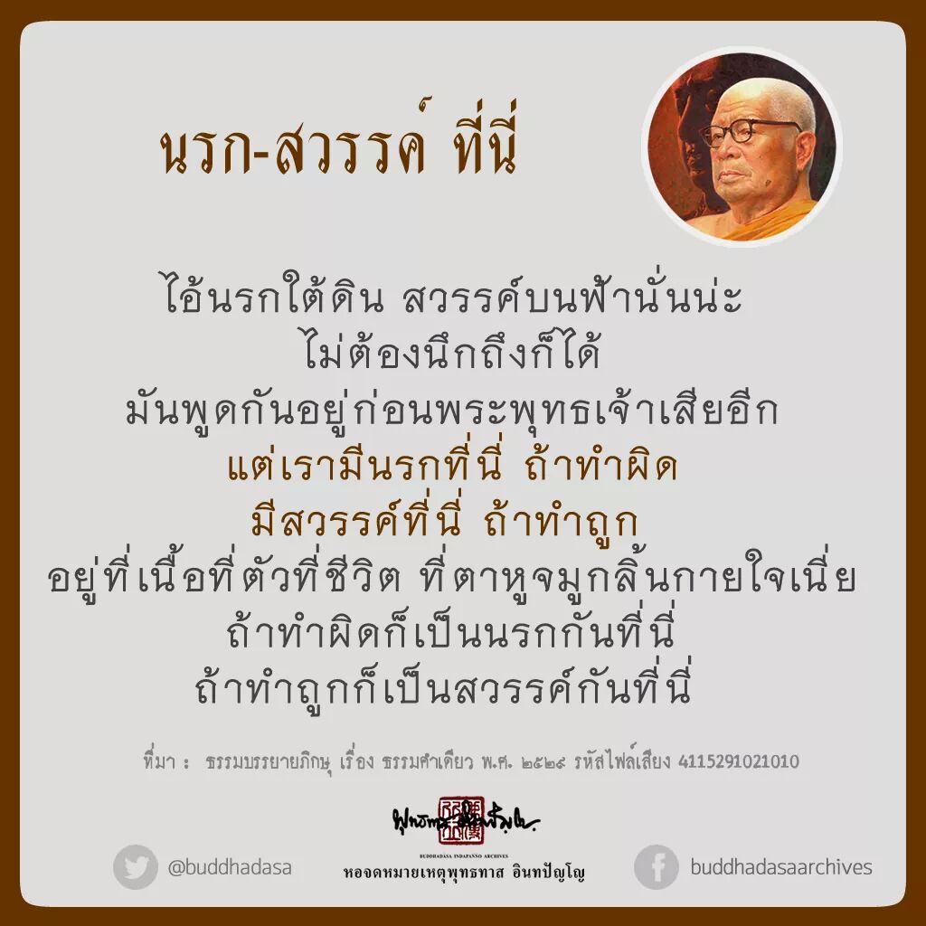 สวรรค์อยู่ในอกนรกอยู่ในใจ ผู้เขียน : พุทธทาสภิกขุ ชื่อชุด : ธรรมโฆษณ์ ![]() ธรรมะนั้นมันเป็นเรื่องจิตใจ พระธรรมเป็นเรื่องจิตใจ เป็นเรื่องความรู้ที่ตั้งอยู่บนจิตใจ พระธรรมไม่ใช่วัตถุ พระธรรมไม่ใช่โบสถ์วิหารเจดีย์ ไม่ใช่พระพุทธรูป ไม่ใช่คัมภีร์พระไตรปิฎก พระธรรมนั้นเป็นเรื่องทางจิตใจ ความรู้ของจิตใจ อยู่ที่จิตใจ ผู้ที่เขารู้เขาเห็น ความข้อนี้ เขาจึงเอาเรื่องในใจเป็นหลัก คำพูดจึงได้เกิดขึ้นมาว่า สวรรค์อยู่ในอก นรกอยู่ในใจ นิพพานก็เหมือนกัน แต่ไม่ค่อยมีใครพูด ที่ชาวบ้านพูดกันโดยมาก อย่างเก่งก็พูดว่า สวรรค์ในอกนรกในใจ ที่จะพูดว่านิพพานก็อยู่ในใจ นั้นไม่ค่อยได้ยินพูด. แต่เอาเถอะ มันพอแล้วแหละ มันพอแล้ว ว่าสวรรค์อยู่ในอก นรกอยู่ในใจ อกใจในที่นี้นี่อย่างเดียวกันแหละ คืออยู่ในจิตใจ พอทำผิดก็เป็นนรกขึ้นมาในจิตใจ เบ็นมารร้ายขึ้นมาในจิตใจ พอทำถูกก็เป็นสวรรค์อยู่ในจิตใจ เป็นเทพเจ้าอยู่ในจิตใจ นี่ช่วยกันระวังให้ดี มันจะโง่มากเกินไปนะ ระวังให้ดี เพราะว่ามันได้เกิดอยู่จริง ในหัวใจของเรา มันเกิดแล้วเกิดเล่า เกิดแล้วเกิดอีก อยู่ในหัวใจของเรา แล้วเรายังไม่รู้นี่ เราโง่สักเท่าไร ทั้งที่สวรรค์ในอกนรกในใจนี่ มันเกิดแล้วเกิดเล่าอยู่ในหัวใจของเรา จนนับไม่ถ้วนแล้วเราก็ยังไม่รู้ นี้คือคนประมาท นี้คือคนหลับตา ยังหลับอยู่ ยังไม่ตื่นจากหลับ คือกิเลส ยังไม่ตื่นจากหลับคือกิเลส จึงไม่รู้ว่าสวรรค์อยู่ในอก นรกอยู่ในใจ ฟ้าสางระหว่าง ๕๐ ที่สวนโมกข์ ตอน ๑ ธรรมโฆษณ์ l พุทธทาสภิกขุ (น.๒๒๗) ที่มา : https://pagoda.or.th/general-knowledge/2021-08-20-05-29-34.html ![]() ![]() ![]() ขอบคุณภาพจาก : https://pantip.com/topic/34038089 ![]() "สวรรค์อยู่ในอก นรกอยู่ในใจ" (หลวงปู่จันทร์ศรี จนฺททีโป) " .. "บุญนั้นเป็นอย่างไร บาปนั้นเป็นอย่างไร" ในขณะใดที่ใจของเรามีปิติยินดี หรือใจของเราเยือกเย็นสงบระงับ "นั่นเรียกว่าบุญ" ถ้าในขณะใดที่ใจของเรามีความโกรธ ความฉุนเฉียว มีความคับแค้นใจในขณะนั้น "เรียกว่าใจเป็นบาป" ที่นี้ โบราณท่านพูดไว้ว่า "สวรรค์อยู่ในอก นรกอยู่ในใจ" ทำไมท่านถึงพูดคำอย่างนี้ เพราะมันเป็นปัญหาอันละเอียดอ่อน "ในขณะใดที่ จิตใจเรามีอารมณ์ อันเยือกเย็นอารมณ์ดี ท่านเรียกว่าขึ้นสวรรค์" คนทั้งหลายเข้าใจว่า สวรรค์อยู่บนชั้นฟ้า "สวรรค์อยู่ในอกเรานี้เอง นรกก็อยู่ในอกเรานี้เอง" อยู่ในใจ ในขณะใด "ที่ท่านโกรธแสดงโทสะแสดงออกมาทางกายทางวาจา นี้ก็เรียกว่า ตกนรกทั้งเป็น" ที่จริงก็ไม่ได้ไปอยู่ที่ไหน หรอกนรก "ที่จริงมันอยู่ที่ตัวของเรานี่เอง" ถ้าเรามาพิจารณากันให้ชัดอย่างนี้ "เราจะได้มาแก้ไขที่จิตใจของ