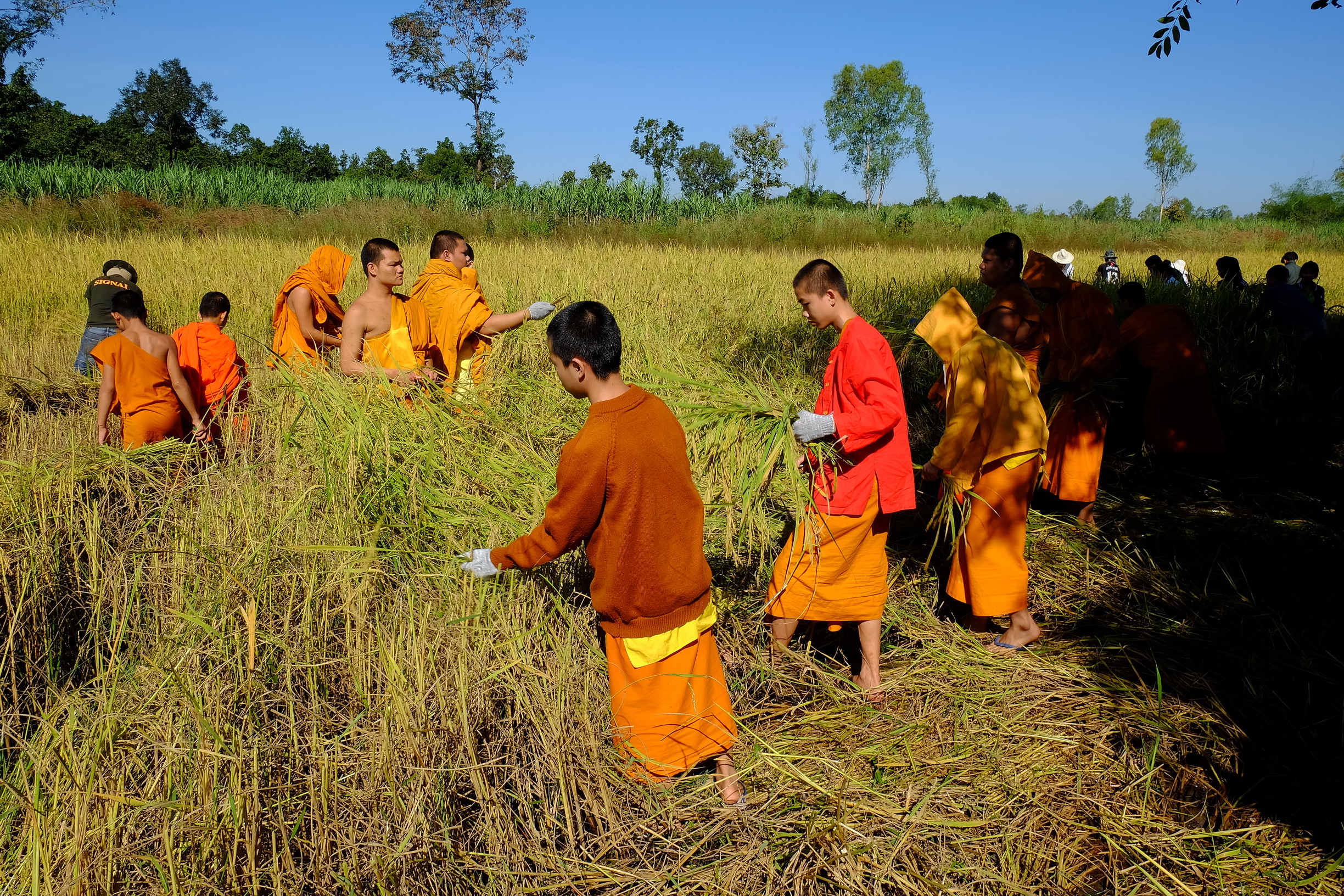 วันที่ 12 พฤศจิกายน 2559 เมื่อเวลา 09.00 น. พระครูสุญาณโสภิต เจ้าอาวาสวัดพระธาตุราษฎร์บำรุง เจ้าคณะตำบลหนองกอมเกาะ อ.เมืองหนองคาย นำพระ สามเณร ของวัด และนักเรียนชายหญิงโรงเรียนหลวงพ่อดำวิทยา รวม 89 คน ไปช่วยนางทองอยู่ ดอนประจง อายุ 69 ปี บ้านสร้างพอก ต.โพนสว่าง อ.เมืองหนองคาย เกี่ยวข้าวในที่นา 12 ไร่ แต่การเกี่ยวข้าวในครั้งนี้ค่อนข้างลำบาก เพราะต้นข้าวโดนลมพัดทำข้าวล้ม แถมยังมีฝนตกก่อนหน้านี้หลายวันทำให้มีน้ำขังในที่นา