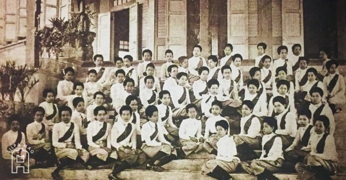 สมเด็จพระบรมราชินีนาถ สมเด็จพระบรมราชเทวี และพระอัครราชเทวี พร้อมด้วยเจ้าจอมมารดา และเจ้าจอม ณ อัฒจันทร์ พระที่นั่งวิมานเมฆ (ภาพจาก หนังสือ “พระตำหนักสวนสี่ฤดูพระราชวังดุสิต” )