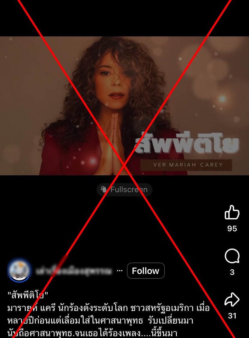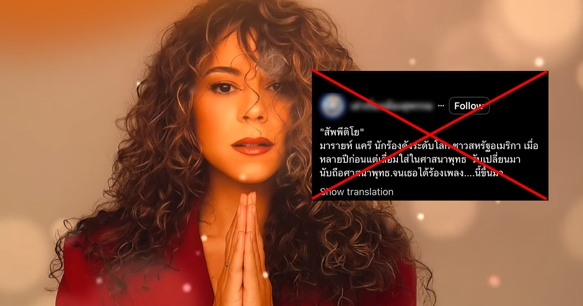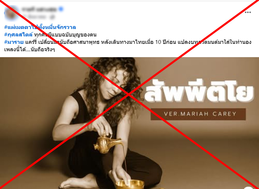 ตรวจสอบแล้ว : โพสต์อ้าง Mariah Carey สวดบทสัพพีติโยอย่างไพเราะ พร้อมเปลี่ยนมาเลื่อมใสพุทธ แท้จริงสร้างจาก AI