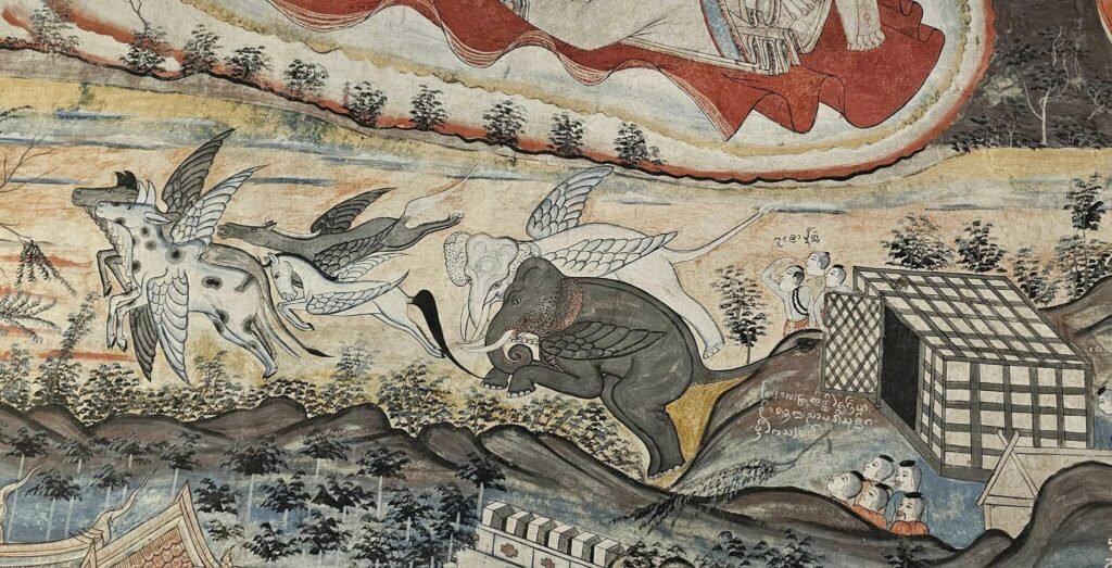 • ช้างแก้ว หรือ ช้างเผือกในตระกูลฉัททันต์และตระกูลอุโปสถ และม้าแก้ว ม้าในตระกูลสินธพ เป็นสัตว์คู่บุญที่เหาะมาสู่พระญาจักรวรรดิราชแล้วพาพระองค์ไปเวียนเขาพระสุเมรุราช เลียบกำแพงจักรวาล จากนั้นกลับมาให้ทันเวลาอาหารเช้า