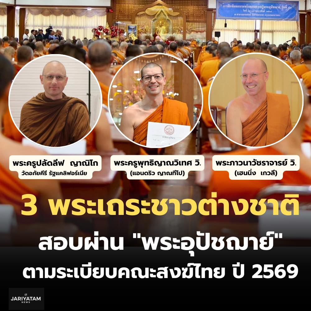 ชื่นชม 3 พระเถระชาวต่างชาติ สอบผ่านเป็น "พระอุปัชฌาย์"พุทธศาสนิกชนสุดปีติ! ชื่นชม 3 พระเถระชาวต่างชาติ สอบผ่านเป็น "พระอุปัชฌาย์" ตามระเบียบคณะสงฆ์ไทย นับเป็นก้าวสำคัญและเป็นเรื่องราวที่สร้างความปลาบปลื้มใจให้แก่พุทธศาสนิกชนทั่วโลก เมื่อมีการเปิดเผยข้อมูลอันน่าเลื่อมใสว่า มีพระภิกษุชาวต่างชาติ (พระฝรั่ง) ถึง 3 รูป ที่ได้แสดงให้เห็นถึงความวิริยะอุตสาหะและวัตรปฏิบัติอันงดงาม จนสามารถผ่านการอบรมและสอบความรู้เพื่อเป็น "พระอุปัชฌาย์" ตามระเบียบของคณะสงฆ์ไทย ประจำปี 2569 ได้อย่างสมบูรณ์แบบทุกประการ